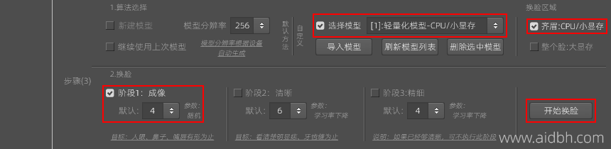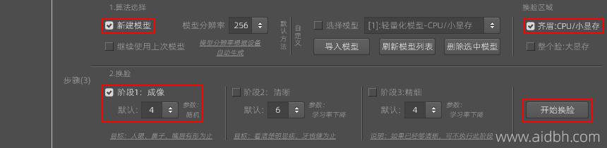 1.算法使用自定义勾选[选择模型][轻量化模型CPU/小显存];换脸区域勾选【齐眉】;换脸勾选【阶段1:成像】;参数保持默认【4】;最后点击【开始换脸】。