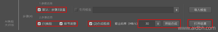 参数勾选【默认:步骤3设置】;步骤选项勾选【换脸】【细节调整】【合成视频】;输出码率设置【30】;点击【开始合成】;结束后点击【打开结果】就可以看到换脸完成的视频了。